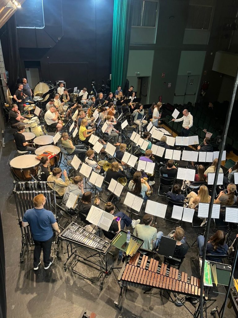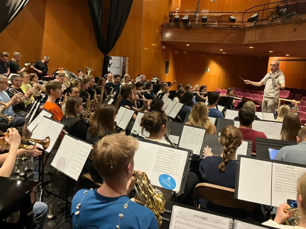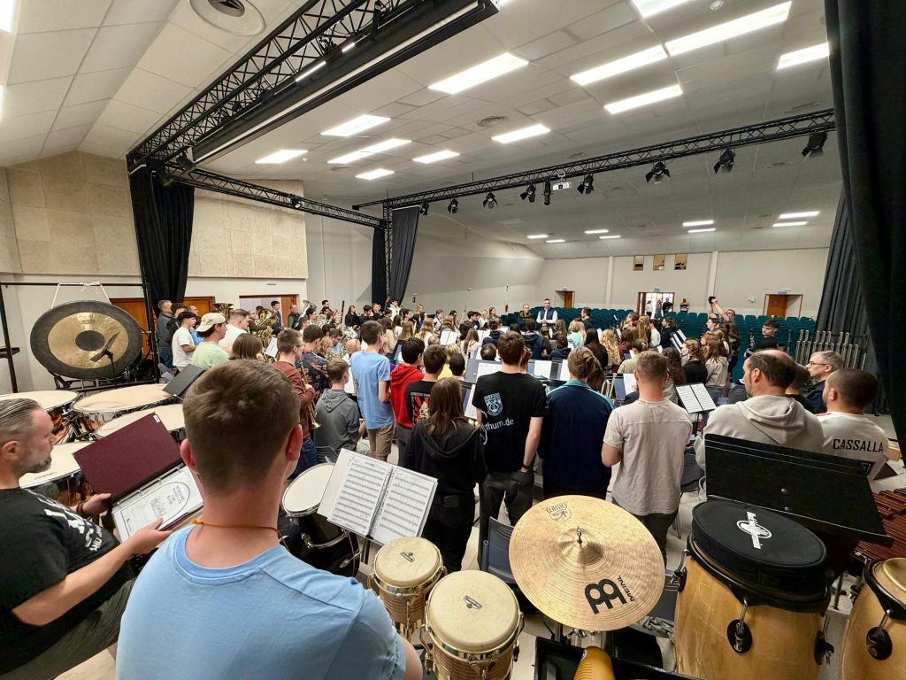 Nach dem gemeinsamen Frühstück im Hotel mussten heute zunächst noch Pauken, ein Vibraphon und Röhrenglocken, die bei der hiesigen Musikschule gemietet wurden, von dort abgeholt und zum Konzertort gebracht werden. In geübter Weise ging der Aufbau und die Bestuhlung der Bühne im „TACS“ zügig vonstatten, so dass pünktlich 10:30 Uhr mit der ca. zweistündigen Probe begonnen werden konnte.