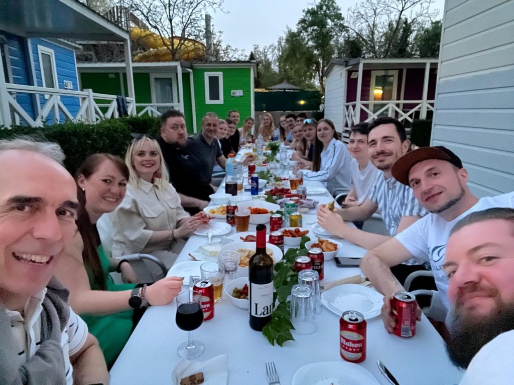 Am Abend trafen sich einige aus dem Camp zu einem gemeinsamen Abendessen. Ursprünglich war dafür ein Tisch mit sieben Stühlen eingeplant… Nun sitzen wir mit 32 Personen an insgesamt sieben Tischen und genießen gemeinsam den Abend bei angenehm warmen Temperaturen.