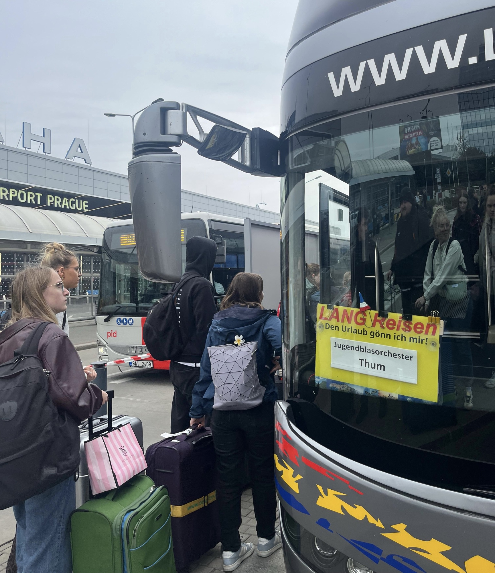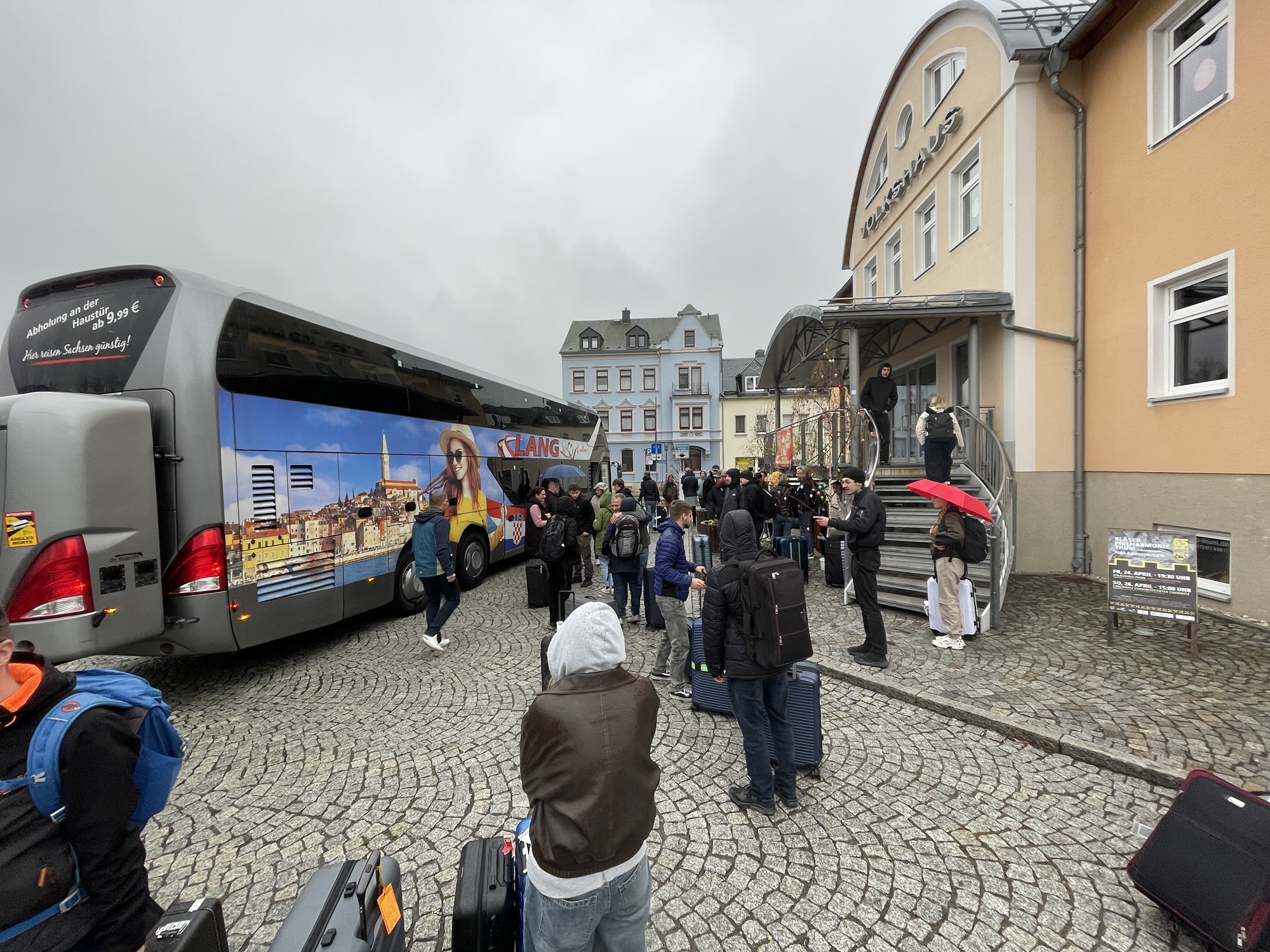 Endlich war es so weit. Donnerstagmorgen um 3.30 Uhr startete der erste Bus am Volkshaus Thum zum BER. Bei -2 Grad Celsius fiel der Abschied nicht schwer. Trotz der frühen Morgenstunde kam sogar unsere Vorstandsvorsitzende Britt Anger vorbei, um uns zu verabschieden. Der zweite Bus startete um 4.30 Uhr. Auf dem Weg stiegen jeweils Musikerinnen und Musiker aus Chemnitz, Dresden oder Leipzig zu.