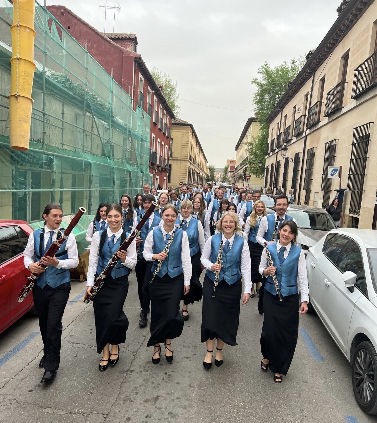 Frisch gestärkt trafen wir uns um 17:45 Uhr erneut, diesmal in Marschformation. Ein kleiner Marsch durch Aranjuez stand an. Natürlich durfte dabei unser traditioneller Steigermarsch nicht fehlen, der durch die Straßen klang und für Aufmerksamkeit sorgte. Hinter uns marschierte auch das Orchester aus Aranjuez, das mit eigenen traditionellen Marschnoten für musikalische Abwechslung sorgte. So entstand ein schöner musikalischer Zug durch die Stadt, der gegen 18:30 Uhr direkt in unser Konzert im Konzertsaal überging.